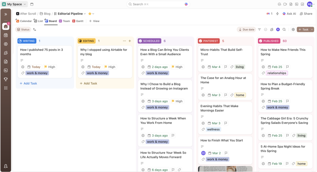 That’s what this season of writing felt like for me. Less like a frantic sprint, more like a beautifully run production line for my brain. And the tool making all of it possible? ClickUp — a free project management app that became the quiet engine behind everything I publish at After Scroll.
